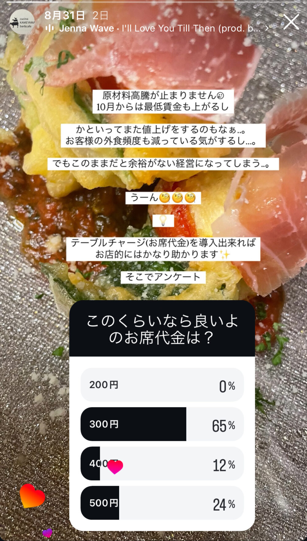 正直これで来店数が減ってしまったりしたら問題になりますが、アンケートをとったところ、お席代金300円までならOKです。が多数を占めていたので思い切ってお席代金を頂戴するようにしました。